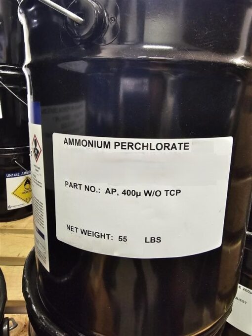 Ammonium Perchlorate, 400 Microns, 55 LB Pail is a premium-grade chemical oxidizer used in the manufacturing of solid rocket propellants, pyrotechnics, and other energy-based applications. With a particle size of 400 microns, this product offers consistent and efficient combustion, making it an essential component in industries that require precise chemical reactions for performance and safety.